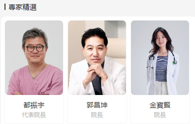 - 都振宇代表院長:首爾大醫學博士,擅長各類抗衰及注射項目,所有填充類注射(如玻尿酸、膠原)均由都院長親自操刀,手法精準,效果自然,避免過度醫美的尷尬。