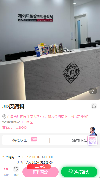 - 進入 JD 醫院頁面後,可查看醫院介紹、中韓文地址與營業時間、當月項目價目表及優惠活動等。