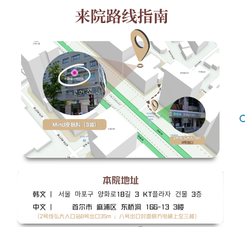 弘大 MIND 皮肤科位於首爾最熱鬧的弘大商圈,鄰近2 號線弘大入口站 8 號出口,步行僅 35 公尺就能抵達,不管是觀光還是專程醫美,交通都超便利,非常適合台灣自由行旅客安排行程。